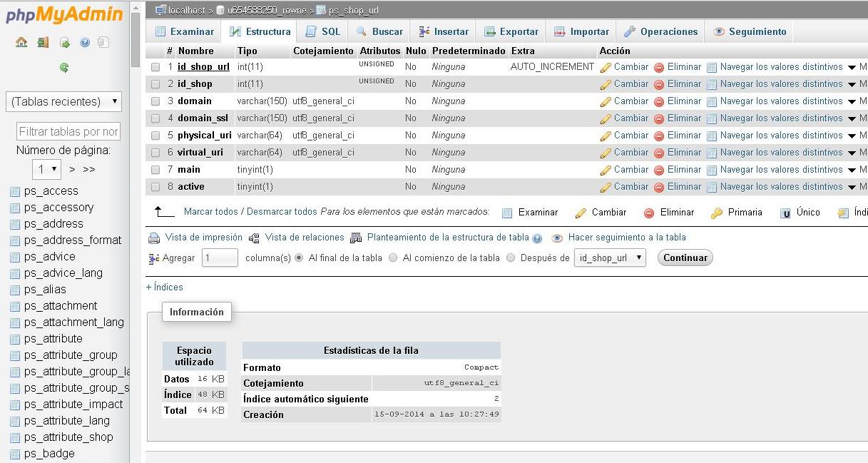 jcdli Posted September 17, 2014 Author Share Posted September 17, 2014 Adjunto pantallazo de ps_shop_url - Estructura. Puede ser que porque esté marcado el auto_increment sea lo que da el error? Link to comment Share on other sites More sharing options...
