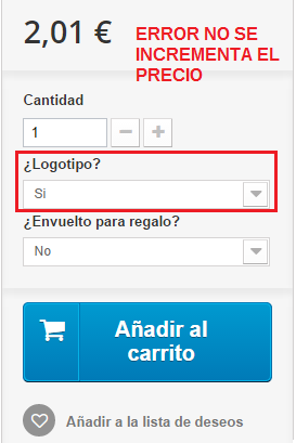 Rolandpd Posted December 4, 2014 Share Posted December 4, 2014 Hola tengo la versión PrestaShop 1.6.0.9 y lo que me ocurre es lo siguiente: Al agregar varias combinaciones en los artículos una siempre me deja de funcioanar. Me explico: He añadido una combinación que sea Envolver para regalo Si/No con un desplegable de forma que el precio se incremente si marca en SI y todo va perfecto, pero a la hora de añadir otra ya sea lista desplegable o radiobuttons ya sólo me funciona una y me lo aplica al precio, la otra ya no me funciona, es decir, el precio no se actualiza para sumar esa segunda combinación. Alguien sabe porque este error¿?¿? he leido muchisimos hilos en este foro, en otros, me recorrido google, y no encuentro la solución a mi problema Os dejo el ejemplo para que veáis lo que me sucede con capturas: 001.png 002.png 003.png Por favor alguien podría ayudarme? Muchisimas gracias. Un saludo. Tengo el mismo problema. identico. Link to comment Share on other sites More sharing options...