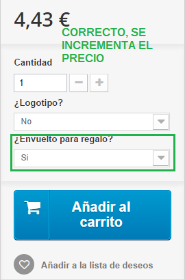BorjaAE Posted September 18, 2014 Share Posted September 18, 2014 Hola tengo la versión PrestaShop 1.6.0.9 y lo que me ocurre es lo siguiente: Al agregar varias combinaciones en los artículos una siempre me deja de funcioanar. Me explico: He añadido una combinación que sea Envolver para regalo Si/No con un desplegable de forma que el precio se incremente si marca en SI y todo va perfecto, pero a la hora de añadir otra ya sea lista desplegable o radiobuttons ya sólo me funciona una y me lo aplica al precio, la otra ya no me funciona, es decir, el precio no se actualiza para sumar esa segunda combinación. Alguien sabe porque este error¿?¿? he leido muchisimos hilos en este foro, en otros, me recorrido google, y no encuentro la solución a mi problema Os dejo el ejemplo para que veáis lo que me sucede con capturas: Por favor alguien podría ayudarme? Muchisimas gracias. Un saludo. 1 Link to comment Share on other sites More sharing options...