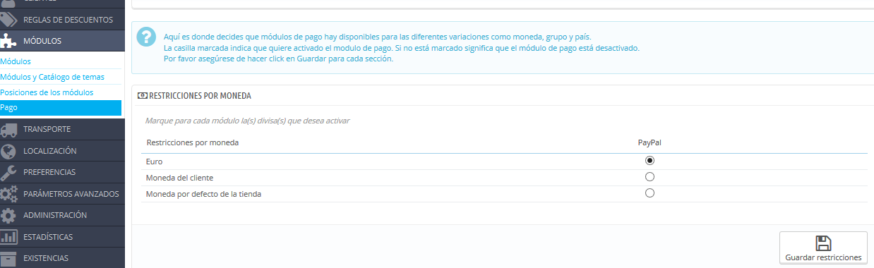 El pollo Posted September 19, 2014 Author Share Posted September 19, 2014 Hola de nuevo, gracias a la sugerencia de Nadie en otro post, me he dado cuenta que tenía sin marcar la moneda que se acepta para los pagos por Paypal, me indujo al error el hecho de que en el texto de la configuración ponía restricciones por moneda, con lo cual daba por hecho que al estar desmarcada esa opción estaría correcta, sin embargo, en la "letra pequeña" es donde se indica lo de "marque para cada módulo la divisa que desea activar",en fin que ya está solucionado el tema, os adjunto una imagen para que sepais a lo que me refiero. Muchas gracias, doy el tema por solucionado. Salud amigos. Link to comment Share on other sites More sharing options...