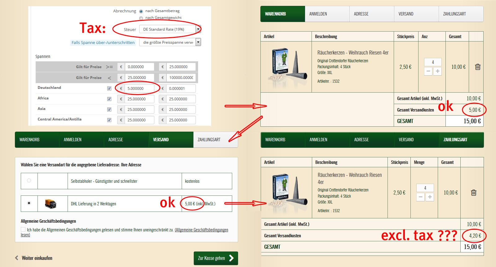andre.markus Posted September 19, 2014 Share Posted September 19, 2014 Hallo Fans, ich hab gerade ein Phänomen, dass die Versandkosten beim Bestellabschluss falsch angezeigt werden und zwar ohne die Steuer. Konkret eingestellt 5,-€ mit dt. MwSt (19%)im Warenkorb - korrekt (5€) bei Versandwahl - korrekt (5€) beim Abschluss - falsch: 4,20€ also ohne Steuer. ist das ein Bug??? Ich hab prestashop 1.6.0.8 Anbei ein Screenshot zum Nachvollziehen. ich hoffe jemand kann helfen... Gruß André Link to comment Share on other sites More sharing options...