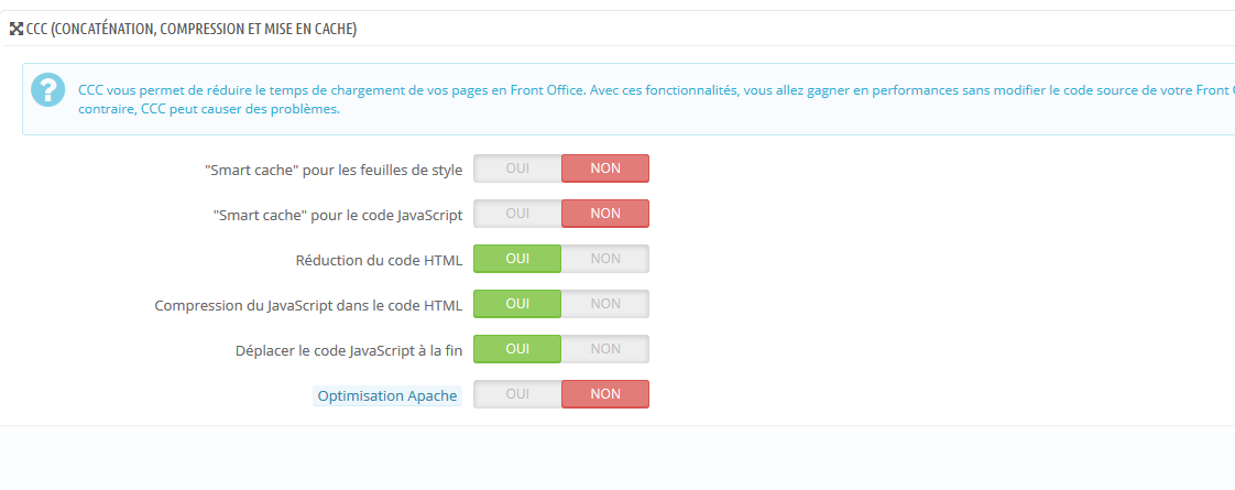 MisterX123 Posted November 27, 2014 Share Posted November 27, 2014 Malheureusement dans mon back office prestashop 1.6 je n'ai pas cela, je n'ai que : "Smart cache" pour les feuilles de style "Smart cache" pour le code JavaScript Réduction du code HTML Compression du JavaScript dans le code HTML Optimisation Apache J'ai tout essayé mais ça n'a pas marché Link to comment Share on other sites More sharing options...