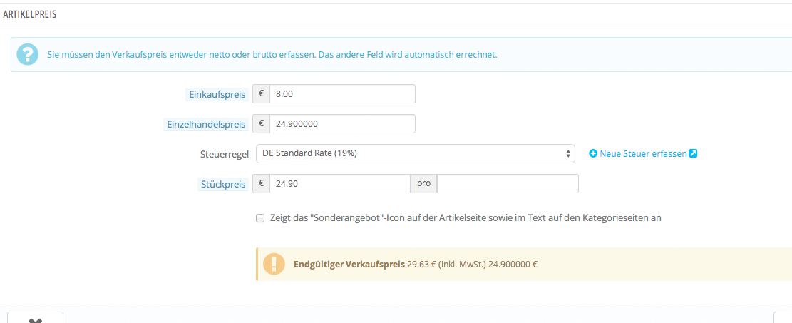 kreativkratzer Posted September 24, 2014 Share Posted September 24, 2014 Habe plötzlich das Problem, dass ich keine Brutto Preise mehr eingeben kann.Was habe ich falsch gemacht, was übersehe ich gerade? Link to comment Share on other sites More sharing options...