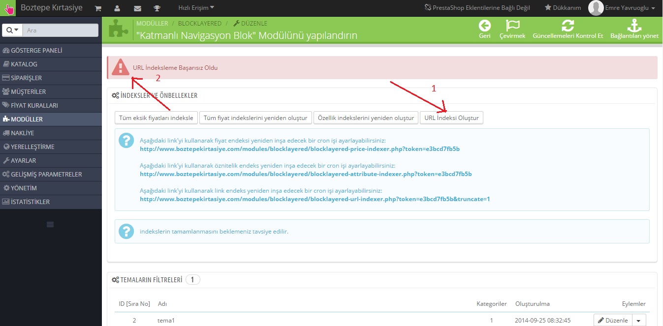 istemsiz Posted September 25, 2014 Author Share Posted September 25, 2014 (edited) Yukarıdaki soruma ek olarak sabah sabah gözlemlediğim bir kaç noktayı size aktarmak istiyorum ; Navigasyon modülünü kaldırdım tekrar kurdum "etkin değil , aktif" ayarlarından. Daha sonra varsayılan ayarları uygula dedim . Tekrar içine girip bir tema oluşturdum filtreleri seçtim , kategorileri seçim. Şuan baktığımda Şahin bey sevgili dostlar forum sakinleri navigasyon blogu artık hiç görüntülenmiyor , sol sütunda çıkmıyor artık. İşin üzücü tarafı çalışıyordu durup dururken gitti modül (en azından ben kurcalamadım hiçbir şeyi)... , sevgili dostlar aylarınızı veriyorsunuz bu tip bilgiyi mantığı aşan hatalar çıkınca üzülüyor insan , herkese prestashop'u tavsiye edecek durumdayken bir anda o kadar bunalıyorsunuz ki , ne söyleyeceğimi bilemiyorum. Yardımlarınızı bekliyorum..... Saygılarımla Son düzenleme : Navigasyon modülü ayarlarına girince aşağıdaki ekte eklediğim resimdeki gibi indekslemelere tıklayınca başarısız hatası alıyorum belki sorunun çözümüne yardımcı olur diye ekledim.... Edited September 25, 2014 by istemsiz (see edit history) Link to comment Share on other sites More sharing options...