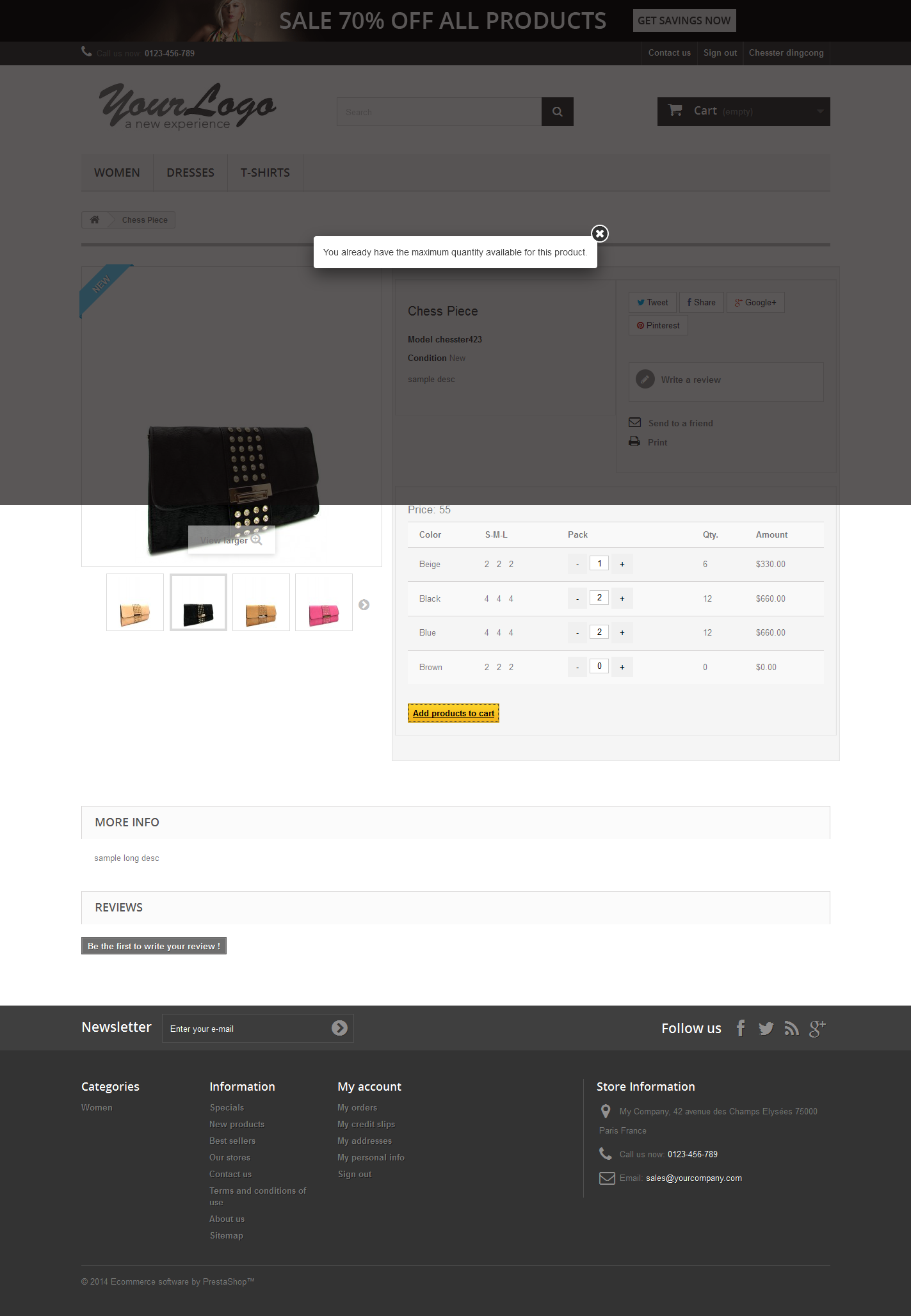 chesspiece423 Posted September 25, 2014 Share Posted September 25, 2014 (edited) I want to add a function that adds multiple product attributes to the cart. But I always get "You already have the maximum quantity available for this product" even though: 1. I have already set "Allow Orders" when out of stock 2. Enabled "Allow ordering of out-of-stock products" at Preferences>Product 3. Put quantity of each attribute to 9999. 4. Followed this guide: http://nemops.com/prestashop-cart-multiple-products-quantities/ But still, the "You already have the maximum quantity available for this product" always appear. I've done this function in Prestashop 1.5. It seems not to work on 1.6. I don't know why. Please help. Thanks My Code: $(document).on('click', '.multi_add', function(e){ e.preventDefault(); var idProduct = $('.id_product').attr('data-id-product'); $('.qty_box').each(function(){ var qty = $(this).val(); if (qty != 0) { ajaxCart.add(idProduct, $(this).attr('id'), true, null, qty, null); } }); Edited September 25, 2014 by chesspiece423 (see edit history) Link to comment Share on other sites More sharing options...