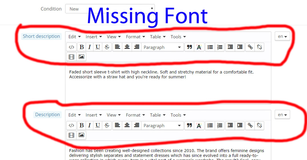 tonytoh Posted September 25, 2014 Share Posted September 25, 2014 Hi, I have problem in back-end after restore a backup from my server. (Prestashop version 1.4.6.2)Catalog> Category> Add a New Product>Short Description & Description Font Missing.Attached file of Before and After. Hope any [spam-filter] can help me please. THANK YOU Link to comment Share on other sites More sharing options...