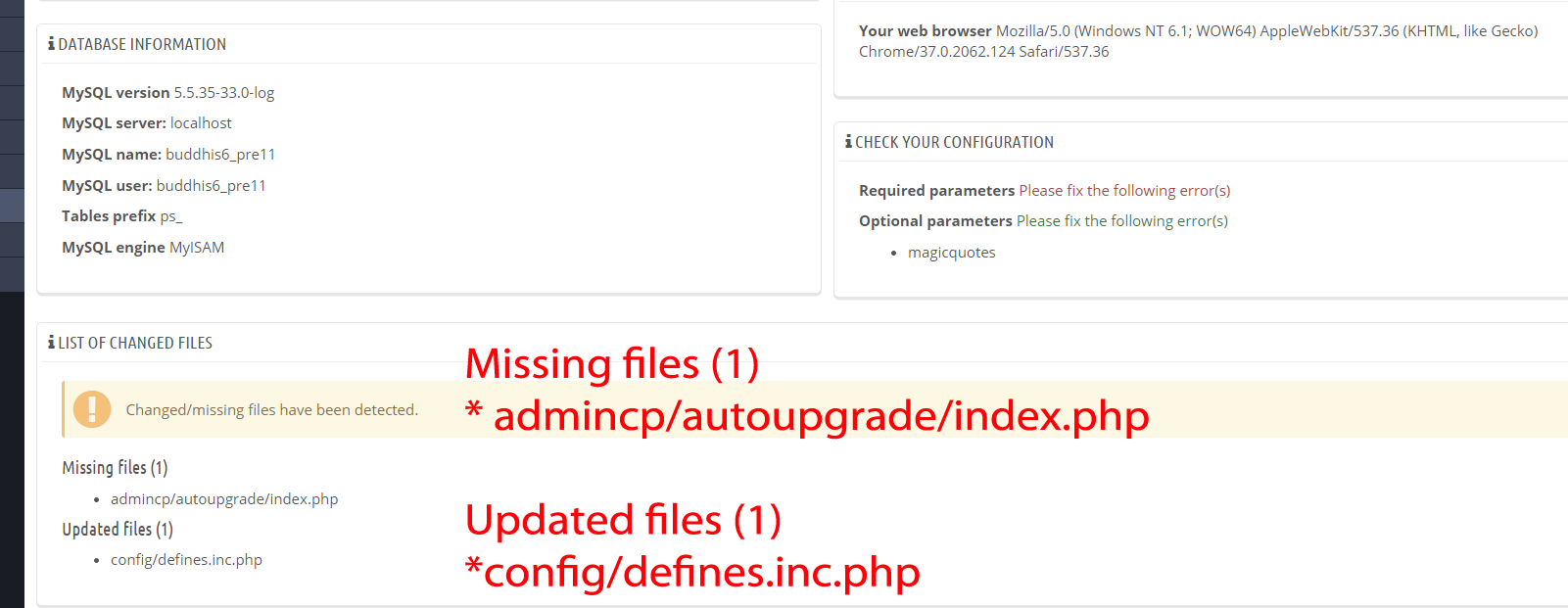 tonytoh Posted September 27, 2014 Author Share Posted September 27, 2014 Hi Mac, Thank you very much for you help, the error one Solved .(Missing files (1) * admincp/autoupgrade/index.php) Still have one more error show up Updated files (1)config/defines.inc.php Link to comment Share on other sites More sharing options...