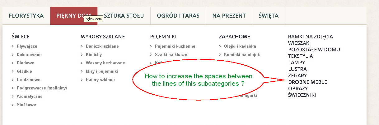 reno123 Posted September 27, 2014 Share Posted September 27, 2014 As the title... I would like to change (incsrese) the line-height of subcategories. See the image below Link to comment Share on other sites More sharing options...