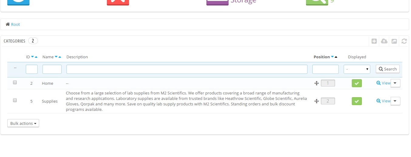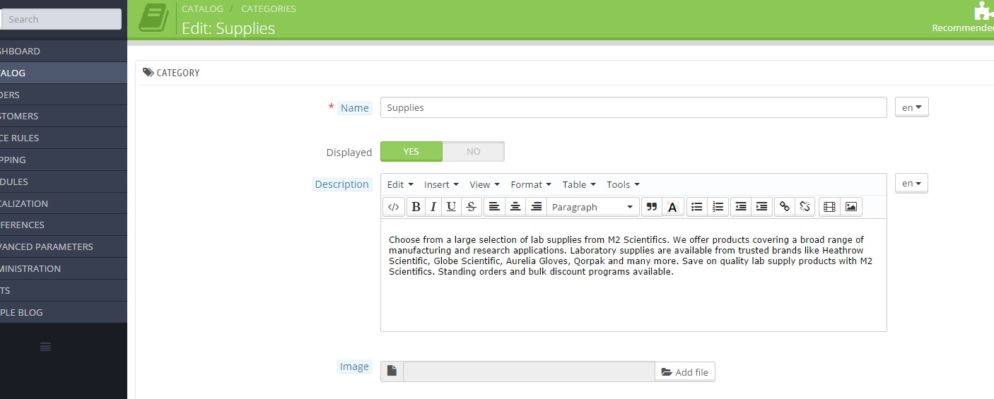M2Sci Posted October 1, 2014 Share Posted October 1, 2014 I'm using the newest version of Prestashop and the back office categories is giving me a problem. I went into one of our subcategories to delete the image associated with that category (it was too small for the new theme we installed). After deleting the image and saving the work, the category was removed from the home category and placed as it's own root directory. Now that link is throwing a 404 error. When I go back to fix the problem, there is no place to change the category position. I uploaded the picture again, hoping that would fix the problem, and it did not. So, I deleted the image. This time, the category folders popped up and allowed me to select the parent category for the one I was working on. I selected "HOME" to place it back where it belonged, saved, and it still has not worked. When I go back into the category again, the categories folder does not show. It will only show when I add and then delete the image. That subcategory has many other subcategories, all of which are now showing a 404 error. PLEASE HELP! SEE ATTACHED SCREEN SHOTS 1 Link to comment Share on other sites More sharing options...