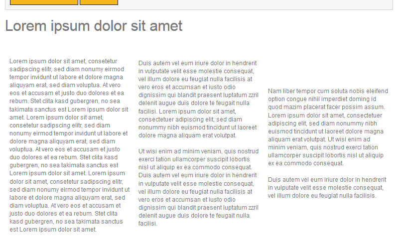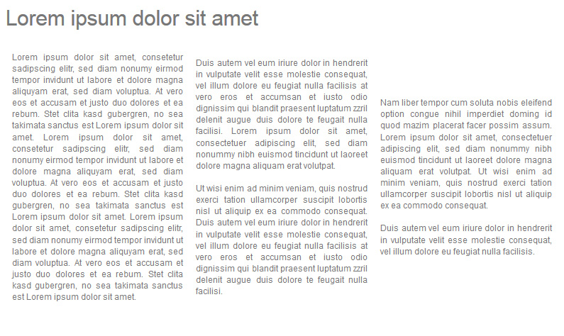 Mutabor Posted October 2, 2014 Share Posted October 2, 2014 Versuch es mal so: <h1>Lorem ipsum dolor sit amet</h1> <table style="width: 100%;" border="0" cellspacing="10"> <tbody> <tr valign="top"> <td align="justify" width="33%">Lorem ipsum dolor sit amet, consetetur sadipscing elitr, sed diam nonumy eirmod tempor invidunt ut labore et dolore magna aliquyam erat, sed diam voluptua. At vero eos et accusam et justo duo dolores et ea rebum. Stet clita kasd gubergren, no sea takimata sanctus est Lorem ipsum dolor sit amet. Lorem ipsum dolor sit amet, consetetur sadipscing elitr, sed diam nonumy eirmod tempor invidunt ut labore et dolore magna aliquyam erat, sed diam voluptua. At vero eos et accusam et justo duo dolores et ea rebum. Stet clita kasd gubergren, no sea takimata sanctus est Lorem ipsum dolor sit amet. Lorem ipsum dolor sit amet, consetetur sadipscing elitr, sed diam nonumy eirmod tempor invidunt ut labore et dolore magna aliquyam erat, sed diam voluptua. At vero eos et accusam et justo duo dolores et ea rebum. Stet clita kasd gubergren, no sea takimata sanctus est Lorem ipsum dolor sit amet.</td> <td align="justify" width="33%">Duis autem vel eum iriure dolor in hendrerit in vulputate velit esse molestie consequat, vel illum dolore eu feugiat nulla facilisis at vero eros et accumsan et iusto odio dignissim qui blandit praesent luptatum zzril delenit augue duis dolore te feugait nulla facilisi. Lorem ipsum dolor sit amet, consectetuer adipiscing elit, sed diam nonummy nibh euismod tincidunt ut laoreet dolore magna aliquam erat volutpat. <br /><br />Ut wisi enim ad minim veniam, quis nostrud exerci tation ullamcorper suscipit lobortis nisl ut aliquip ex ea commodo consequat. Duis autem vel eum iriure dolor in hendrerit in vulputate velit esse molestie consequat, vel illum dolore eu feugiat nulla facilisis at vero eros et accumsan et iusto odio dignissim qui blandit praesent luptatum zzril delenit augue duis dolore te feugait nulla facilisi.</td> <td align="justify" width="34%">Nam liber tempor cum soluta nobis eleifend option congue nihil imperdiet doming id quod mazim placerat facer possim assum. Lorem ipsum dolor sit amet, consectetuer adipiscing elit, sed diam nonummy nibh euismod tincidunt ut laoreet dolore magna aliquam erat volutpat. Ut wisi enim ad minim veniam, quis nostrud exerci tation ullamcorper suscipit lobortis nisl ut aliquip ex ea commodo consequat. <br /><br />Duis autem vel eum iriure dolor in hendrerit in vulputate velit esse molestie consequat, vel illum dolore eu feugiat nulla facilisis.</td> </tr> </tbody> </table> Link to comment Share on other sites More sharing options...