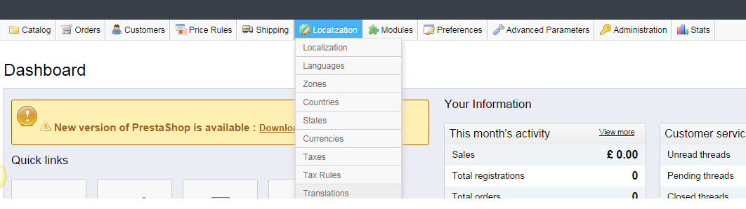 Can you be a bit more specific I cant find a 'back office/translations' tab our pull down from the prestashop menu choices. I have "catalogs, orders, customers......tabs to pull down but nothin gin that row or any pull down has "back office/translations"