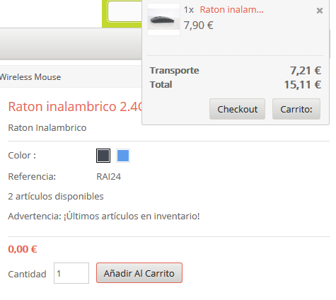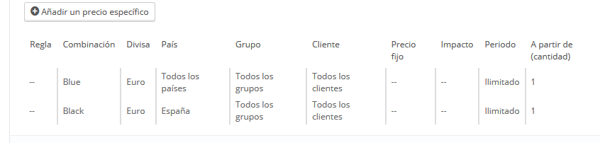 Quiero crear una combinacion de colores para un producto, por ejemplo un raton para ordenador lo tengo en blanco y negro, me voy a la pestaña de combinaciones, y añado los dos colores. Luego en la pestaña de precio añado los colores creados anteriormente y en la pestaña de cantidad añado las cantidades corespondientes para los colores.