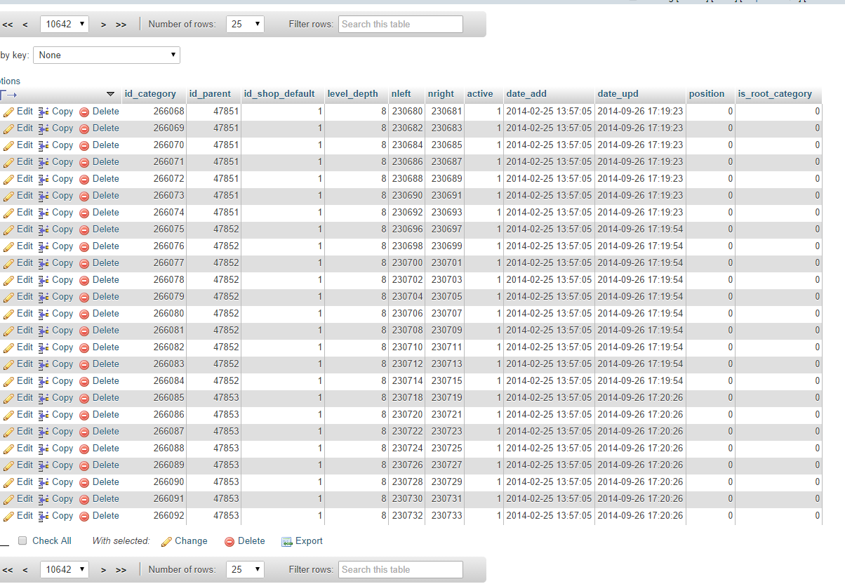 Vaupell Posted October 6, 2014 Author Share Posted October 6, 2014 (edited) Almost everything works. Except we still can't access products "AT ALL" it just crashes, We can browse the categories just fine, and they still all work fine in the front office. However, if i try to edit or add a category i get this error Fatal error: Maximum execution time of 90 seconds exceeded in D:\xampp\htdocs\HJA\classes\tree\Tree.php on line 240 Tree.php is also the thing causing problems for the products, because i can open a single product through the "backway" through monitoring and selecting a product there ofcourse it cannot be modified because it wants to access the categories and end up erroring anyway. Still clueless. EDIT - Also adding a screenshot of a random part of the categories db... hoping that someone can see if there is something wrong there. Edited October 6, 2014 by Vaupell (see edit history) Link to comment Share on other sites More sharing options...