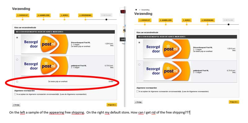 bbouhuis Posted October 5, 2014 Share Posted October 5, 2014 Hi, I have a weird problem with free shipping. First of all I do not want a free shipping option below my shipping options in the front office. well I have several stores with the same setup, same carriers, same shipping costs the only difference is the frontend shop. In my default store everything is working fine (NO free shipping option). But in my other stores the free shipping is popping up and I dont know where is coming from. I hope anyone can help me. See also the attached screenprint Edwin Link to comment Share on other sites More sharing options...