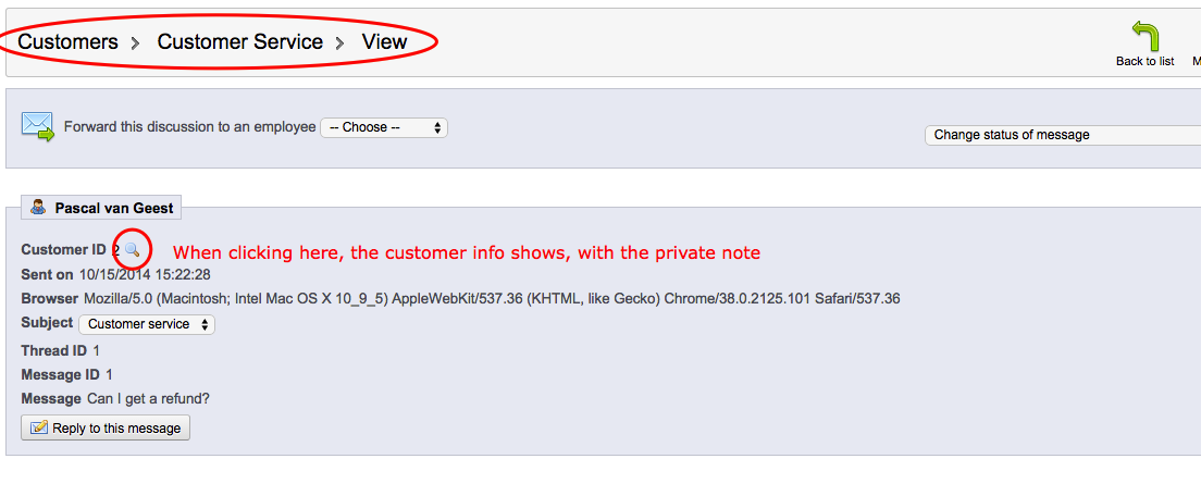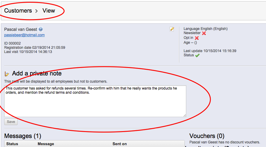 PascalVG Posted October 15, 2014 Share Posted October 15, 2014 (edited) Hi Guidos, the customer private note will be, as said, only be displayed (not send!) to the employees, not to the customer him/herself. It's a field where you can write about that customer, for example, communication with the customer ("customer contacted us about shipping on 7 June"), problems with the customer (late payer, frequently asking for refunds, etc). The employee dealing with this customer can read these notes and uses this info when dealing with the customer. So, when the customer sends a message through the contact form, an employee sees this message, and can quickly go the the customer's info by clicking on the amp. glass icon. It will show the customer info, including this private note. That's all, noting spectacular... Hope this helps, pascal Edited October 15, 2014 by PascalVG (see edit history) Link to comment Share on other sites More sharing options...