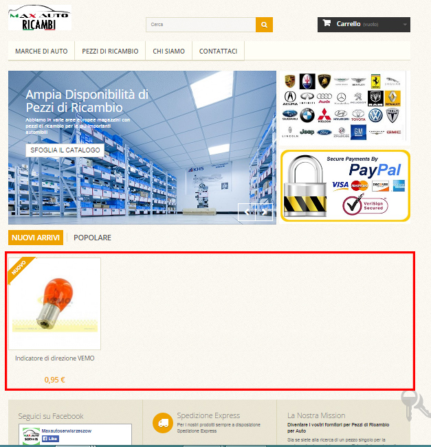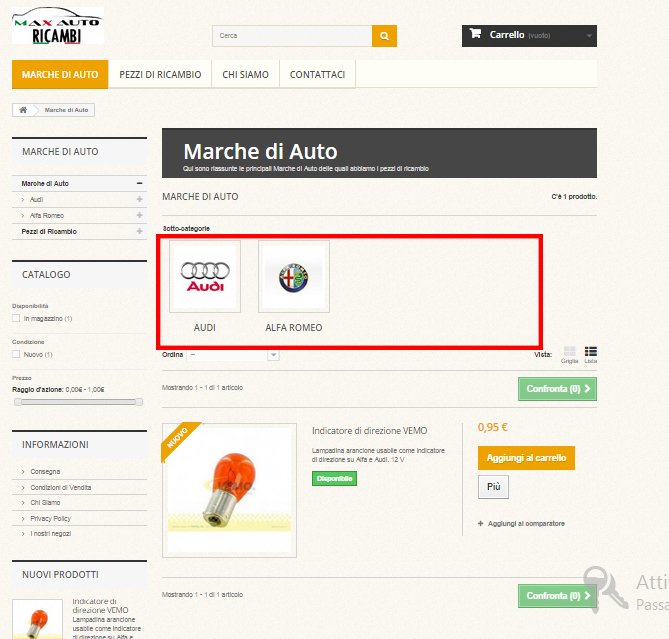 uber_loller Posted October 7, 2014 Share Posted October 7, 2014 Hello everyone, i'm trying to modify/override prestashop 1.6 modules/classes/controllers in order to achive some custom needings on maxautoricambi.com website. One of them is to show inside the homepage instead of producs in "new arrivals (nuovi arrivi)" and "popolare (popolari)" respectivly sub categories from "marche di auto" and "pezzi di ricambio" with image representing subcategories and subcategories name at the bottom. Can you provide me any soluition (if some1 has did this before) or any hint for overriding purposes and how to call that subcategory view? Screenshots added to understand better what its needed to do. Basically Place the content shown spotted in the red rectangle in 2.jpg inside the red rectangle in 1.jpg cheers! Link to comment Share on other sites More sharing options...