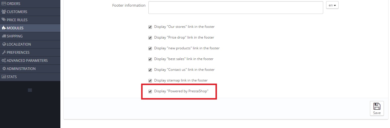 Paulito Posted October 11, 2014 Share Posted October 11, 2014 Hello again You need to go to: public_html/Your Shop/themes/default-bootstrap/modules/blockcms/blockcms.tpl Scroll down to the bottom of the page you will see this code: (change the code in Red) © 2014 {l s='[1]Ecommerce software by %s[/1]' mod='blockcms' sprintf=['PrestaShop™www.prestashop.com">]} For Example: © 2013 {l s='[1] The name of my shop is, %s[/1]' mod='blockcms' sprintf=['disneylandparis.co.uk] tags=['<a class=_blank" href="http://www.disneylandparis.co.uk">]} Before http://screencast.com/t/LrWyvuLs After http://screencast.com/t/cXlY7X01vbs Paul Link to comment Share on other sites More sharing options...
