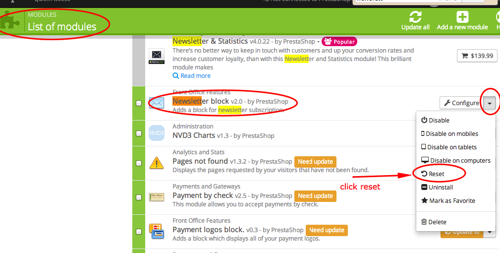 PascalVG Posted October 13, 2014 Share Posted October 13, 2014 1) themes/default-bootstrap/css/product.css, line 753: .box-security { border-top: 1px solid #dfdede; padding: 19px 19px 30px; <-- change to 30px background-image: -webkit-gradient(linear, 50% 0%, 50% 100%, color-stop(0%, #ffffff), color-stop(100%, #fbfbfb)); background-image: -webkit-linear-gradient(#ffffff, #fbfbfb); background-image: -moz-linear-gradient(#ffffff, #fbfbfb); background-image: -o-linear-gradient(#ffffff, #fbfbfb); background-image: linear-gradient(#ffffff, #fbfbfb); filter:progid:DXImageTransform.Microsoft.gradient(startColorstr='#fff', endColorstr='#fbfbfb',GradientType=0 ); } 3) Newsletter block. Did you uninstall it, or only disabled, or removed from the front page in live view? Anyway, go to Modules->Modules and find the "Newsletter Block" module. Then, - if it currently is uninstalled, press install. - If it is disabled, select enable. - If you just removed it from view in live edit or so, press 'reset': To move it to the header is more work. Will have a look at it later if it's easily done or not... 4) You can add the module 'Featured products on the homepage'. Then add the products you would like to show on the home page (ALSO) to the home category in Edit Product->Associations tab: This should do the trick. 5) Do you remember what you did exactly when it went wrong? Did you turn on/off friendly URL? My 2 cents, pascal 1 Link to comment Share on other sites More sharing options...