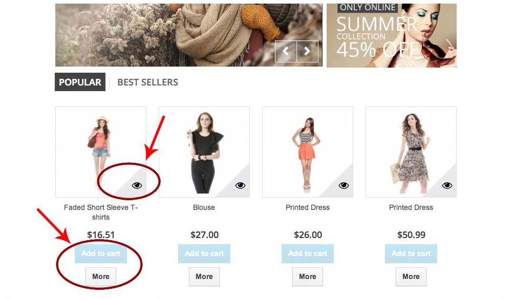 duredo Posted October 15, 2014 Share Posted October 15, 2014 gambar pertama ada di back office > catalog > attributes Gambar kedua untuk icon mata (quick view) edit di css nya, saran ane sih ga perlu di rubah. Untuk tulisan add to cart dan more, rubah di localization > translation Link to comment Share on other sites More sharing options...