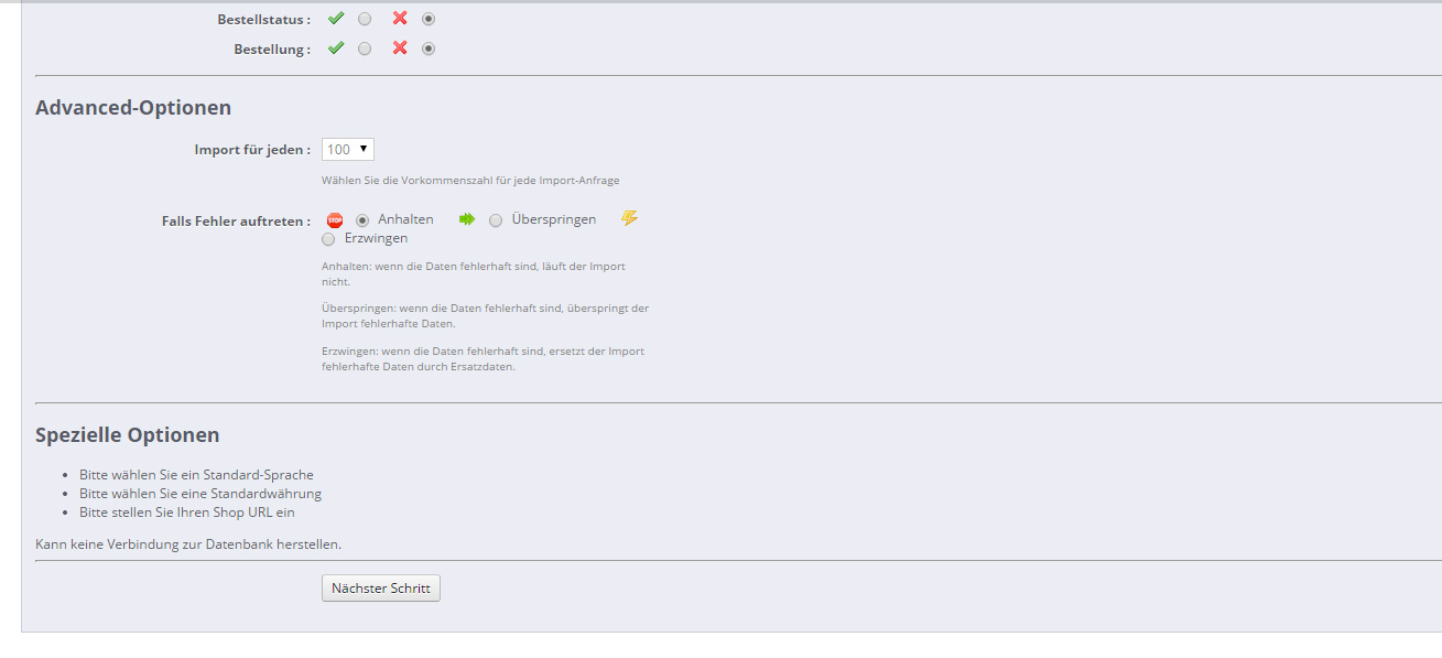 teplice Posted October 15, 2014 Share Posted October 15, 2014 Hallo, ich möchte gerne meine bestehenden Kundenkonten vom OS Commerce in die aktuelle Prestashop importieren inkl. Passwörtern. Folgender Artikel hilft mir sehr weiter:http://www.homepage-community.de/kunden_passworter_aus_xt_commerce_304_in_presta_importieren-t3079.5.html;wap2= Der Code wurde bereits in die importerosc.php eingefügt! Wenn ich dan den Importeur starte kann ich meine Datenbank angeben und was ich importieren möchte, gehe ich dann unten auf weiter und dann erscheinen drei Punkte: Sprache, Standardwährung, Shop Url........ und dann geht es nicht mehr weiter. Bitte um Eure rasche hilfe, oder andere Methode? Kostenpflichtige Tools? Vielen Dank Andreas Link to comment Share on other sites More sharing options...