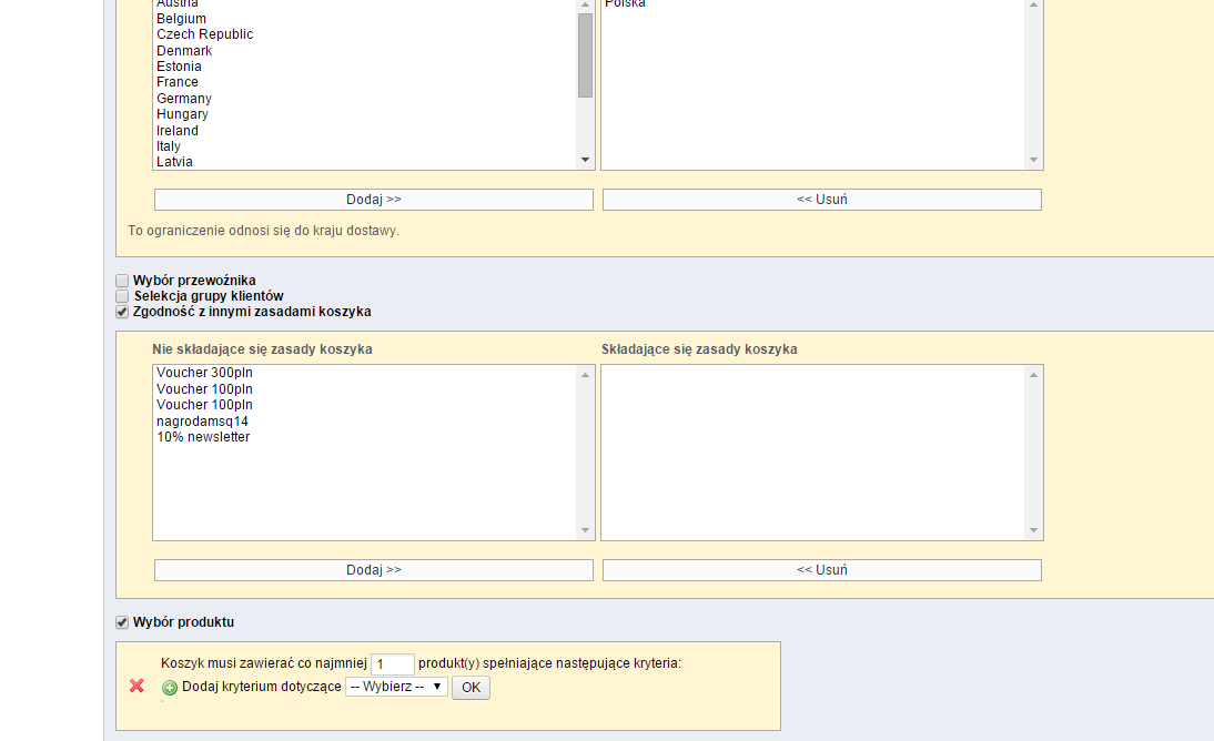 sliw Posted October 15, 2014 Share Posted October 15, 2014 BArdzo pilnem, nagle przestał mi działać możłiwość wyboru produktu / kategori w dodawaniu rabatów. miałem dzisiaj o 19 tej dodać darmową wysyłke jesli w koszyku jest przynajmniej jeden produkt z wybranej kategorii dziala wybór waluty kraju grupy i reszty a poniżej dodanie kategori się łądnie wybiera ale po kliknięciu zapisz niestey nie zapisuje tego wyboru i daje rabat na wszystko Walcze 4 tą godzine szukam i nic. presta to v 1.5.4\ prosze o pilną pomoc Link to comment Share on other sites More sharing options...