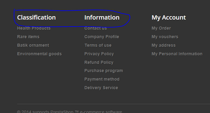 vekia Posted October 17, 2014 Share Posted October 17, 2014 it's a case of translations to translate "information" go to localization > translations > installed modules translations then search for "blockcms", you will see there "Information" field to translate to any other thing you want. Regarding to "Classifications" this blocks displays categories? Link to comment Share on other sites More sharing options...