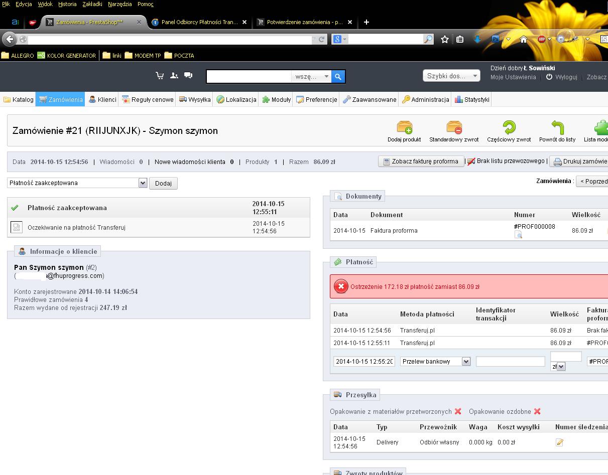 sfora88 Posted October 16, 2014 Share Posted October 16, 2014 Witam Mam problem z płatnościami transferuj.pl. Podczas testów płatności dodają mi się podwójnie wpłaty. A dokładniej wygląda to nastepująco: 1. Po zamówieniu i wybraniu platności przez transferuj.pl w sklepie odrazu odnotowuje mi sie płatność bez id (pojawia się nawet jeśli klient nie dokończy płatności) 2. Po dokonaniu płatności i autoryzacji przez transferuj.pl otrzymuje ponownie płatność tym razem autoryzowaną - jeśli klient faktycznie opłaci- choć także nie dopisuje mi się id. Macie na to jakiś pomysł? Gdzie szukać problemu. Kontaktowałem się z transferuj.pl, ale mówią, że u nich jest wszystko ok. No i wygląda mi to na winę po stronie sklepu. Presta 1.5.6.2 Link to comment Share on other sites More sharing options...