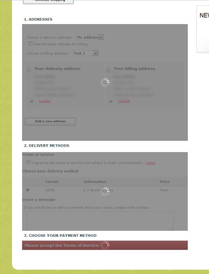 davekeller Posted October 16, 2014 Share Posted October 16, 2014 Hi there, Prestashop crashes whenever my customers try to choose an alternative delivery address for their order: - Customer goes to checkout, and fills in address details - In the next screen > address panel, select an option from the "choose a delivery address" drop-down box OR un-check "Choose a billing address" At this point the "address" panel,"delivery methods" panel and the "choose your payment method" panels all become greyed out, and the spinning wheel is displayed (see image). This doesn't go away until you refresh the screen (but the customer is still unable change delivery address. Please can anyone give me some pointers as to where to start with troubleshooting? Thanks a lot! Link to comment Share on other sites More sharing options...
