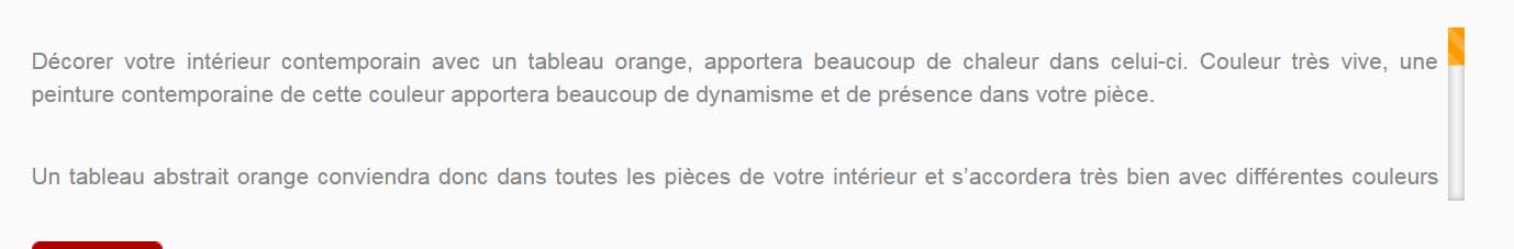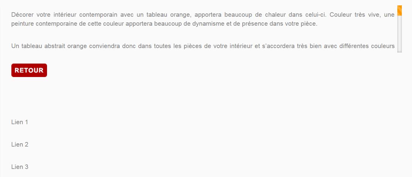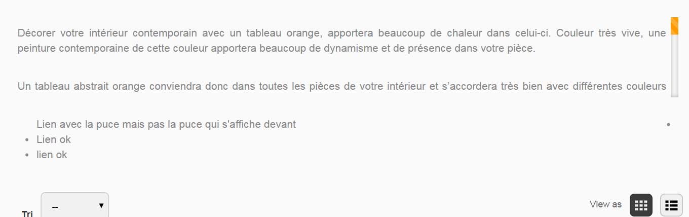 emiliesau86 Posted October 16, 2014 Share Posted October 16, 2014 Bonjour Je vous écris car je suis très ennuyée à propos de code HTLM qui ne fonctionne pas sur mon site. Je ne maîtrise pas bien du tout les codes htlm et tout ce qui est technique, autant vous prévenir mais j'arrive généralement à me débrouiller quand on m'explique bien A mon avis ça devrait fonctionner et c'est plutôt moi qui ne maîtrise pas bien la chose. J'ai besoin de 3 réponses : 1) Sur les fiches produits PRESTASHOP dans le descriptif produit j'aimerais insérer un bouton retour, qui permette au visiteur de revenir à la page précédente. Donc, pas de bouton retour avec un lien vers la page de mon choix (c'est ce que m'a dit de faire une agence web...), je suis sure qu'il existe un bouton car je l'avais inséré sur un ancien site qui n'était pas sur prestashop. Ici, je tape le code dans "code source" au niveau de la fiche produit. Ca s'affiche bien à l'écran mais quand on va sur mon site pour voir le résultat final, aucun lien ne fonctionne. Je ne comprends pas pourquoi du tout 2) Je voudrais insérer de longs textes dans des menus avec ascenseur. Actuellement c'est le cas sur mon site, fait par une agence mais ce n'est adapté que pour les grands écrans !!!! L'ascenseur n'apparait ni sur les petits écrans d'ordinateur ni sur les mobiles ce qui est un gros problème. Donc, je voudrais réduire la largeur du menu Pour plus de détails quand on clique sur une catégorie principale un texte de présentation est dans un menu déroulant, je suis allé voir pour modifier le texte en cliquant sur la case "code source" et on voit bien que quelque chose a été ajouté pour avoir le menu déroulant à savoir ceci <div id="style-scroll" class="scrollbar"> <div class="force-overflow text-descrp"> <p>votre texte ici /></a></p> mais je ne sais pas ce qu'il faut faire pour réduire la taille de ceci après j'ai trouvé ceci sur le net qu'il fallait taper son texte normalement puis passer en mode HTLM puis avant votre texte ajouter : <div style="height: 250px; width: 650px; overflow: auto;">et après votre texte :</div> ceci ressemble à ce que je veux dans mon back office prestashop mais quand on va voir sur le site cela n'a rien à voir du tout et il n' y a pas d'ascenseur, snif !!! 3) J'aimerais insérer, lorsqu'on clique sur une catégorie, des liens les uns sous les autres pour rediriger vers les sous catégories. Donc, je me dis "tiens, je vais mettre des puces" car je vous avoue que si je ne met pas de puces, l'espace entre les lignes quand je fais un saut de ligne est énorme grrrr donc, je mets les puces, hé bien elles s'affichent toutes, sauf la 1ère ce qui n'est pas parfait pour moi !! je n'arrive pas à comprendre pourquoi les puces apparaissent toutes sauf la 1ère. Car sous le menu déroulant actuel, c'est en dessous que je veux ajouter des puces, et la 1ère puce se colle sous la barre du menu déroulant. Je n'y comprends donc rien. LOL bref, j'espère que vous m'avez suivi Si quelqu'un s'y connait se serait très sympa de me donner une explicaton, que se soit pour le point 1,2 ou 3 ou encore mieux pour toutes mes questions ;-) merci par avance, n'hésitez pas à me contacter par message privée ce que je préfère. En pièce jointe les impressions écran 1) Image du menu déroulant que je voudrais réduire en largeur 2) Je peux mettre des liens en dessous mais l'espace entre les liens est trop grand (image A1) 3) Donc par défaut je mets des puces (image A2) mais la première puce ne s'affiche pas en face. Link to comment Share on other sites More sharing options...