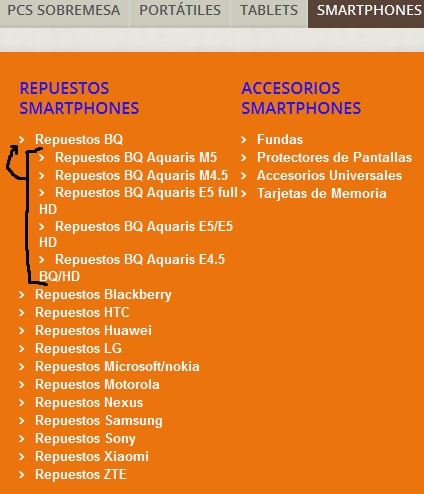 menthar Posted November 5, 2014 Share Posted November 5, 2014 Entiendo lo que quieres decir mas o menos, mi idea es que partan todas las categorías de inicio pero sin subcategorías, si pongo los enlaces a mano ¿no me añade botones al menú? ¿o los puedo poner todos que cuelguen de inicio?. Te dejo el enlace a la pagina para que te hagas una idea del desastre de menú que tengo ahora. Gracia por responder. www.tecnosatgalicia.es Hola agrojo, para quitar los hijos que tu menu en prestashop coloca automaticos puedes utilizar la propiedad de css en tu archivo "tutienda/default-bootstrap/css/modules/blocktopmenu/css/superfish-modified.css": display:none !important; Según quieras eliminar el primer hijo, el segundo etc ... deberas incluir mas o menos referencias a la lista por ejemplo: Eliminar el primer hijo: .sf-menu li li{ display:none !important; } Eliminar el segundo hijo: .sf-menu li li li{ display:none !important; } Espero haberte sido de ayuda, Un saludo 3 Link to comment Share on other sites More sharing options...