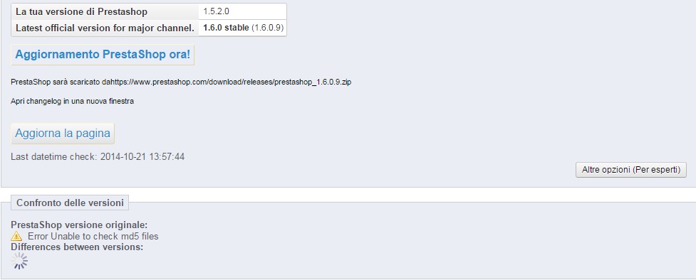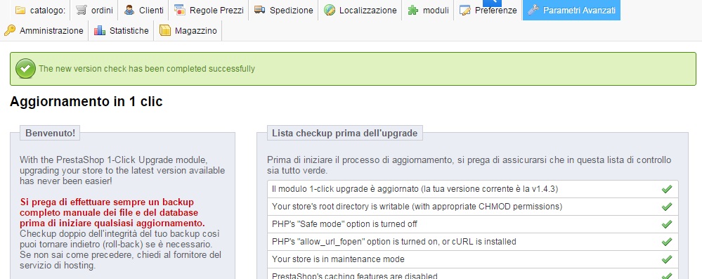 olivier19 Posted October 21, 2014 Share Posted October 21, 2014 Ciao a tutti, come da titolo vorrei passare dalla mia versione attuale che è la 1.5.2 alla 1.6 ma sto incontrando una marea di problemi. Lasciando perdere l'aggiornamento manuale in locale perchè ho provato e riprovato e per quanto semplice a detta di molti è ampiamente oltre le mie possibilità, anche l'aggiornamento con il modulo 1-Click Upgrade non funziona. Ho provato a disinstallarlo, ad eliminarlo, scaricarlo, scompattarlo e ricaricarlo via ftp con filezilla ma niente, non ne vuole sapere. Allego le schermate che vedo se provo a configurare il modulo e ad effettuare l'upgrade, aiuto!!!!!!!!!!!!! PS: il negozio è su server aruba e lo so, a detta di moltissimi fa schifo ma per tutta una serie di ragioni non posso cambiarlo; ho provato ad aprire un ticket e mi è stato risposto di inviare loro le credenziali di accesso al pannello di prestashop perchè avrebbero effettuato loro l'upgade. Inviato il tutto mi hanno risposto di riprovare manualmente l'operazione e di riaprire il ticket (che hanno chiuso) nel caso avessi avuto altri problemi, bella assistenza Link to comment Share on other sites More sharing options...