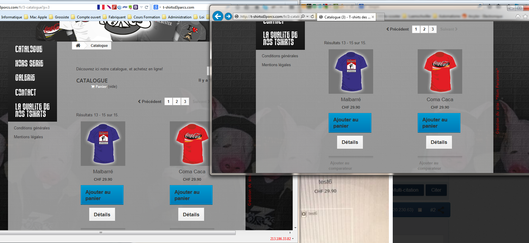 barbarisk Posted October 21, 2014 Share Posted October 21, 2014 Bonsoir,Je cherche un prestataire pour résoudre 2 bugs sur un site PrestaShop qui a été construit assez salement...Tout fonctionnait bien depuis plusieurs mois, mais mon client a acheté un nouveau PC et me signale aujourd'hui 3 nouveaux défauts: un défaut de connexion (je n'en sais pas plus pour l'instant, donc ne rien faire pour l'instant); un défaut d'affichage des noms des articles dans le catalogue (sur le nouvel ordi de mon client, tous les articles s'appellent "test6", alors que sur mes différents ordis ils ont chacun leur vrai nom). et lorsqu'il clic sur un article, la fiche-produit ne s'ouvre pas, il a une page d'erreur blanche "this page can't be displayed". Je vous mets ses copies d'écran ci-jointes.Il me dit que ces problèmes apparaissent sous Internet Explorer 10, mais ça m'étonne car j'ai testé sur la même version et tout s'affiche bien.J'ai fait une recherche sur tout le site avec le mot "test6" pour voir à quel endroit j'ai laissé trainer ça, mais d'après Dreamweaver ça n'apparait nul part, donc c'est un mystère pour moi.Qui pourrait résoudre ces 2 bugs, et surtout pour combien? (budget très serré)Merci Link to comment Share on other sites More sharing options...