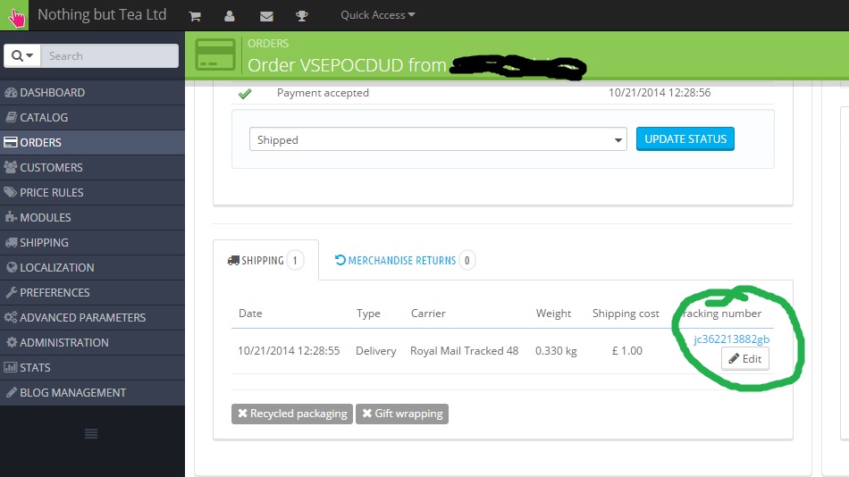 Nothingbuttea Posted October 22, 2014 Author Share Posted October 22, 2014 1.6.0.6 We have been entering the tracking number in the space for the tracking number in the shipping bit on the order page that says tracking number (see below) Link to comment Share on other sites More sharing options...