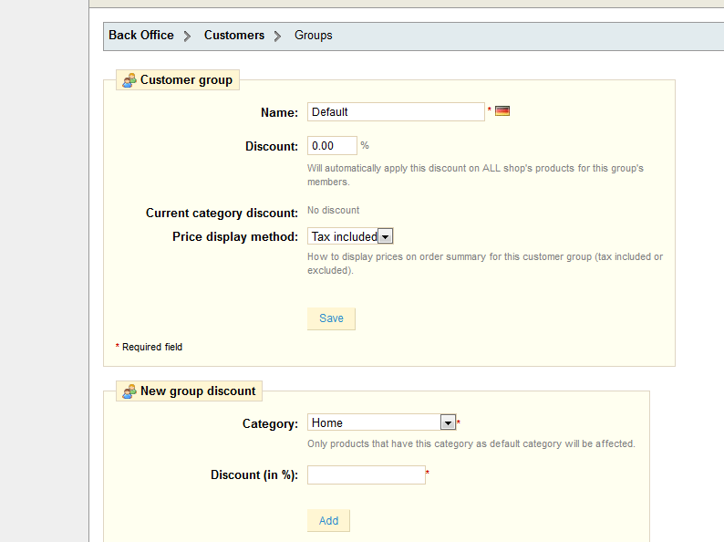 glamundfun2014 Posted October 24, 2014 Share Posted October 24, 2014 (edited) I have a question. I use PrestaShop™ 1.4.8.2. Product price exclusive VAT is 41,67 francs. We have 8 % VAT in Switzerland. I created a tax rule for that and applied to the product. So at the end in the cart if the user is logged in or just gave his address in the checkout the price inclusive VAT will be 45.00 francs. It is working well in my cart. The problem is that if user is not logged in/haven't provided his address yet the product price on the product page is always displayed without VAT! Here in Back Office > Customers > Groups I have chosen Price display method: Tax included. It does not work for the product page if user is NOT logged in/gave address in checkout. Please advice something! Thank you. Edited October 29, 2014 by glamundfun2014 (see edit history) Link to comment Share on other sites More sharing options...