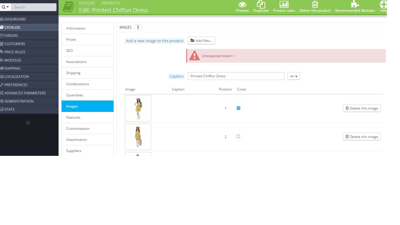 manson84 Posted October 26, 2014 Share Posted October 26, 2014 Dear all, I am unable to upload product images - images turn out to be a grey question mark. After turning on the debug mode, it shows "Unexpected token <" on the product page (see screenshot attached). I searched for similar issues like mine and tried their methods but so far nothing works. Such as this: http://www.prestashop.com/forums/topic/290297-uploading-products-images-issues/ The Img folder have been set to writable recursively. This is a show-stopper and I'm desperate to get this fixed soon. Any [spam-filter] please help? - Chris Link to comment Share on other sites More sharing options...