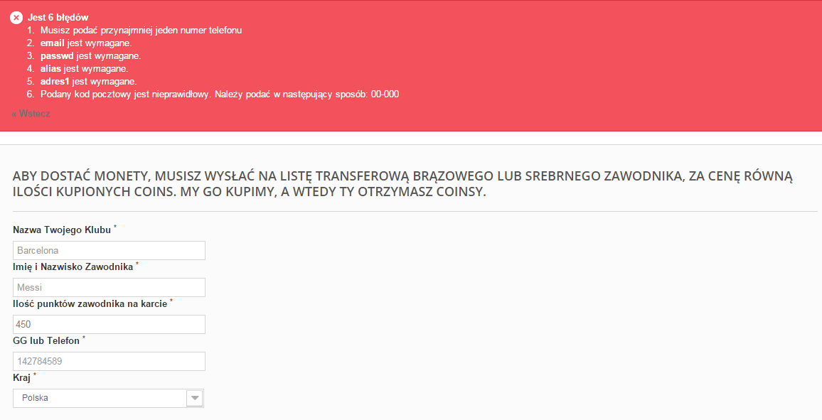 Firex Posted October 26, 2014 Share Posted October 26, 2014 (edited) Tak jak w temacie, dołączam 2 pliki - ss z bledem i moj kod. oczywiscie authentication ma w rzeczywistośći rozszerzenie.tpl <!--{capture name=path} {if !isset($email_create)}{l s='Authentication'}{else} <a href="{$link->getPageLink('authentication', true)|escape:'html':'UTF-8'}" rel="nofollow" title="{l s='Authentication'}">{l s='Authentication'}</a> <span class="navigation-pipe">{$navigationPipe}</span>{l s='Create your account'} {/if} {/capture}--> <h1 class="page-heading">{if !isset($email_create)}{l s='Authentication'}{else}{l s='Create an account'}{/if}</h1> {if isset($back) && preg_match("/^http/", $back)}{assign var='current_step' value='login'}{include file="$tpl_dir./order-steps.tpl"}{/if} {include file="$tpl_dir./errors.tpl"} {assign var='stateExist' value=false} {assign var="postCodeExist" value=false} {assign var="dniExist" value=false} {if !isset($email_create)} <!--{if isset($authentification_error)} <div class="alert alert-danger"> {if {$authentification_error|@count} == 1} <p>{l s='There\'s at least one error'} :</p> {else} <p>{l s='There are %s errors' sprintf=[$account_error|@count]} :</p> {/if} <ol> {foreach from=$authentification_error item=v} <li>{$v}</li> {/foreach} </ol> </div> {/if}--> <!-- KAMIL <div class="row"> <div class="col-xs-12 col-sm-6"> <form action="{$link->getPageLink('authentication', true)|escape:'html':'UTF-8'}" method="post" id="create-account_form" class="box"> <h3 class="page-subheading">{l s='Create an account'}</h3> <div class="form_content clearfix"> <p>{l s='Please enter your email address to create an account.'}</p> <div class="alert alert-danger" id="create_account_error" style="display:none"></div> <div class="form-group"> <label for="email_create">{l s='Email address'}</label> <input type="text" class="is_required validate account_input form-control" data-validate="isEmail" id="email_create" name="email_create" value="{if isset($smarty.post.email_create)}{$smarty.post.email_create|stripslashes}{/if}" /> </div>--> <!-- KAMIL <div class="submit"> {if isset($back)}<input type="hidden" class="hidden" name="back" value="{$back|escape:'html':'UTF-8'}" />{/if} <button class="btn btn-default button button-medium exclusive" type="submit" id="SubmitCreate" name="SubmitCreate"> <span> <i class="icon-user left"></i> {l s='Create an account'} </span> </button> <input type="hidden" class="hidden" name="SubmitCreate" value="{l s='Create an account'}" /> </div> </div> </form> </div>--> <!-- KAMIL <div class="col-xs-12 col-sm-6"> <form action="{$link->getPageLink('authentication', true)|escape:'html':'UTF-8'}" method="post" id="login_form" class="box"> <h3 class="page-subheading">{l s='Already registered?'}</h3> <div class="form_content clearfix"> <div class="form-group"> <label for="email">{l s='Email address'}</label> <input class="is_required validate account_input form-control" data-validate="isEmail" type="text" id="email" name="email" value="{if isset($smarty.post.email)}{$smarty.post.email|stripslashes}{/if}" /> </div>--> <!-- KAMIL <div class="form-group"> <label for="passwd">{l s='Password'}</label> <span><input class="is_required validate account_input form-control" type="password" data-validate="isPasswd" id="passwd" name="passwd" value="{if isset($smarty.post.passwd)}{$smarty.post.passwd|stripslashes}{/if}" /></span> </div> <!--<p class="lost_password form-group"><a href="{$link->getPageLink('password')|escape:'html':'UTF-8'}" title="{l s='Recover your forgotten password'}" rel="nofollow">{l s='Forgot your password?'}</a></p>--> <!-- KAMIL <p class="submit"> {if isset($back)}<input type="hidden" class="hidden" name="back" value="{$back|escape:'html':'UTF-8'}" />{/if} <button type="submit" id="SubmitLogin" name="SubmitLogin" class="button btn btn-default button-medium"> <span> <i class="icon-lock left"></i> {l s='Sign in'} </span> </button> </p> </div> </form> </div> </div>--> {if isset($inOrderProcess) && $inOrderProcess && $PS_GUEST_CHECKOUT_ENABLED} <form action="{$link->getPageLink('authentication', true, NULL, "back=$back")|escape:'html':'UTF-8'}" method="post" id="new_account_form" class="std clearfix"> <div class="box"> <div id="opc_account_form" style="display: block; "> <h3 class="page-heading bottom-indent">{l s='Aby dostać monety, musisz wysłać na listę transferową brązowego lub srebrnego zawodnika, za cenę równą ilości kupionych coins. My go kupimy, a wtedy Ty otrzymasz coinsy.'}</h3> <!-- Account --> <!-- kamil <div class="required form-group"> <label for="guest_email">{l s='Email address'} <sup>*</sup></label> <input type="text" class="is_required validate form-control" data-validate="isEmail" id="guest_email" name="guest_email" value="{if isset($smarty.post.guest_email)}{$smarty.post.guest_email}{/if}" /> </div>--> <!-- kamil <div class="cleafix gender-line"> <label>{l s='Title'}</label> {foreach from=$genders key=k item=gender} <div class="radio-inline"> <label for="id_gender{$gender->id}" class="top"> <input type="radio" name="id_gender" id="id_gender{$gender->id}" value="{$gender->id}"{if isset($smarty.post.id_gender) && $smarty.post.id_gender == $gender->id} checked="checked"{/if} /> {$gender->name} </label> </div> {/foreach} </div>--> <div class="required form-group"> <label for="firstname">{l s='Nazwa Twojego Klubu'} <sup>*</sup></label> <input type="text" class="is_required validate form-control" data-validate="isName" id="firstname" name="firstname" value="{if isset($smarty.post.firstname)}{$smarty.post.firstname}{/if}" /> </div> <div class="required form-group"> <label for="lastname">{l s='Imię i Nazwisko Zawodnika'} <sup>*</sup></label> <input type="text" class="is_required validate form-control" data-validate="isName" id="lastname" name="lastname" value="{if isset($smarty.post.lastname)}{$smarty.post.lastname}{/if}" /> </div> <!-- kamil <div class="form-group date-select"> <label>{l s='Date of Birth'}</label> <div class="row"> <div clas