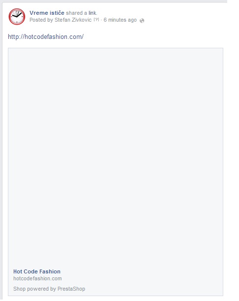 ZikmaSolutions Posted October 26, 2014 Share Posted October 26, 2014 Hello, i search for this issue and can't find solution...#1 - My problem is when I paste my link on facebook i have image from slider o choose. I want to show my LOGO when i paste url. #2 - Second problem is when I paste link as facebook comment, i have this picture(look image). Also i want to sho LOGO everytime.#3 - How to display product image when i paste url of some product.Please help. www.hotcodefashion.com Presta 1.5 Link to comment Share on other sites More sharing options...