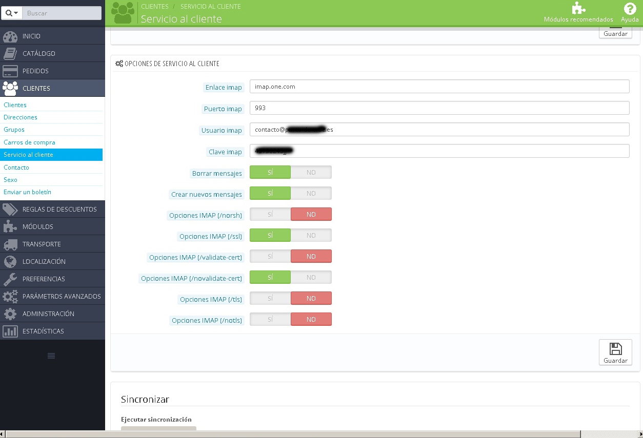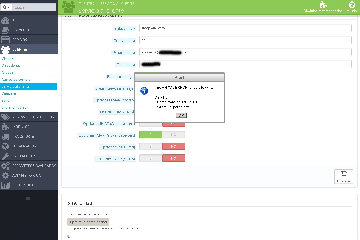Hola , tengo prestashop 1.6 instalado, y hasta hace poco la sincronizacion de correos funcionaba perfectamente, pero hace unos dias me da este error.( Adjunto imagenes de configuracion y del error)
