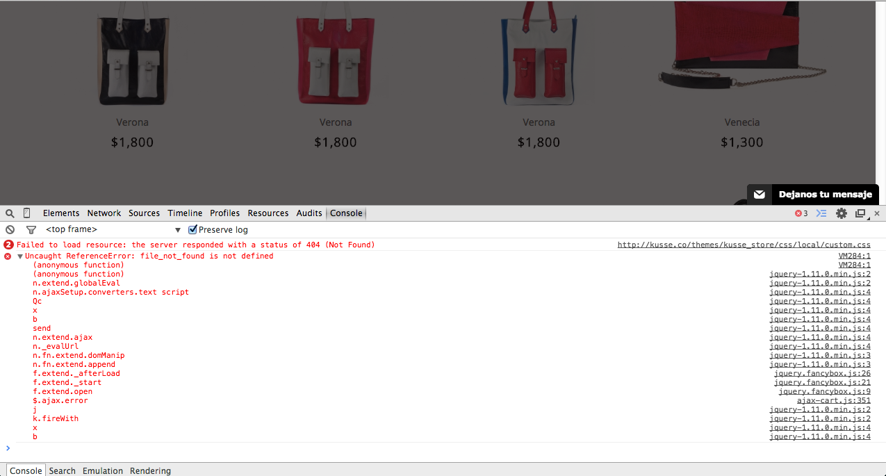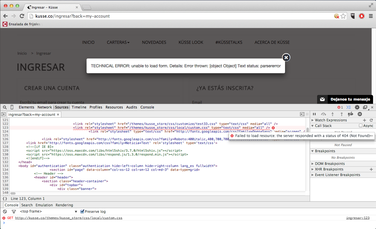 dgmarafi Posted October 28, 2014 Share Posted October 28, 2014 (edited) Hi! I'm working on a site with prestashop 1.6.0.6 with the theme Leo Fashion Store, I worked a lot on the site the past days and now when I turn on friendly URLs I get two mayor issues: 1. Can't create a new customer account, this is the error the system shows: TECHNICAL ERROR: unable to load form. Details: Error thrown: [object Object] Text status: parsererror I searched the forum and tried the different solutions offered in other posts, but nothing works. I've checked all the files I've been working on, but I can't find where the problem is. Turning on Console in Chrome shows this, but I don't know how to interpret it (custom.css file is empty) 2. Can't add products to the cart: In this case the system doesn't show any error. Again, turning on in Chrome shows this: Could someone take a look and check what am I missing? Here's the url to the site: http://kusse.co/ingresar?back=my-account Thanks! Mariana Edited October 29, 2014 by dgmarafi (see edit history) Link to comment Share on other sites More sharing options...