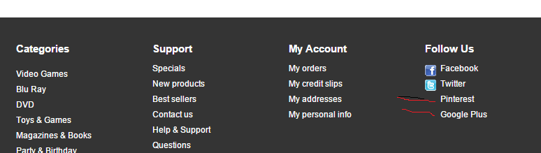 Nick20000 Posted October 30, 2014 Share Posted October 30, 2014 hi. on my footer i have 4 social links but only 2 of the icons are appearing. i have made a new image with icons and took away the rss icon. please take a look as i can't get the other social buttons to appear. added some attachments. Link to comment Share on other sites More sharing options...