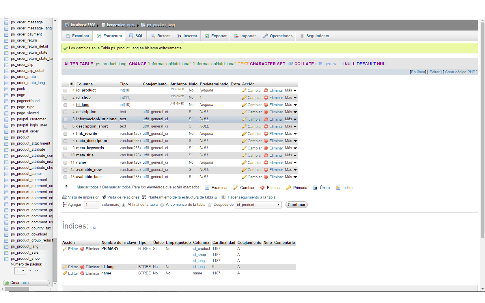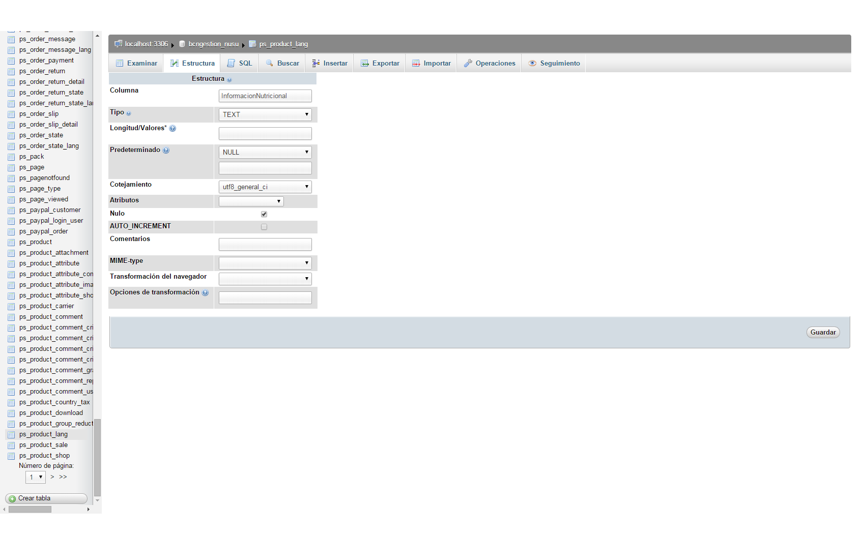 lastapril Posted October 31, 2014 Share Posted October 31, 2014 Has hecho esto ? El campo que acabamos de crear obviamente no viene por defecto en Prestashop, así que no han pensado en dejarnos un campo libre para usarlo, por lo tanto necesitamos entrar a nuestro gestor de la base de datos y añadir nosotros ese campo. Tenéis que buscar la tabla product_lang, por defecto el prefijo de la tabla suele ser ps_, con lo cual buscaríais ps_product_lang, pero puede que tenga otro prefijo diferente (yo por seguridad le suelo cambiar el prefijo). Así que nos vamos a la tabla y modificamos la estructura añadiendo al final un campo que se llame como nuestra variable. Link to comment Share on other sites More sharing options...