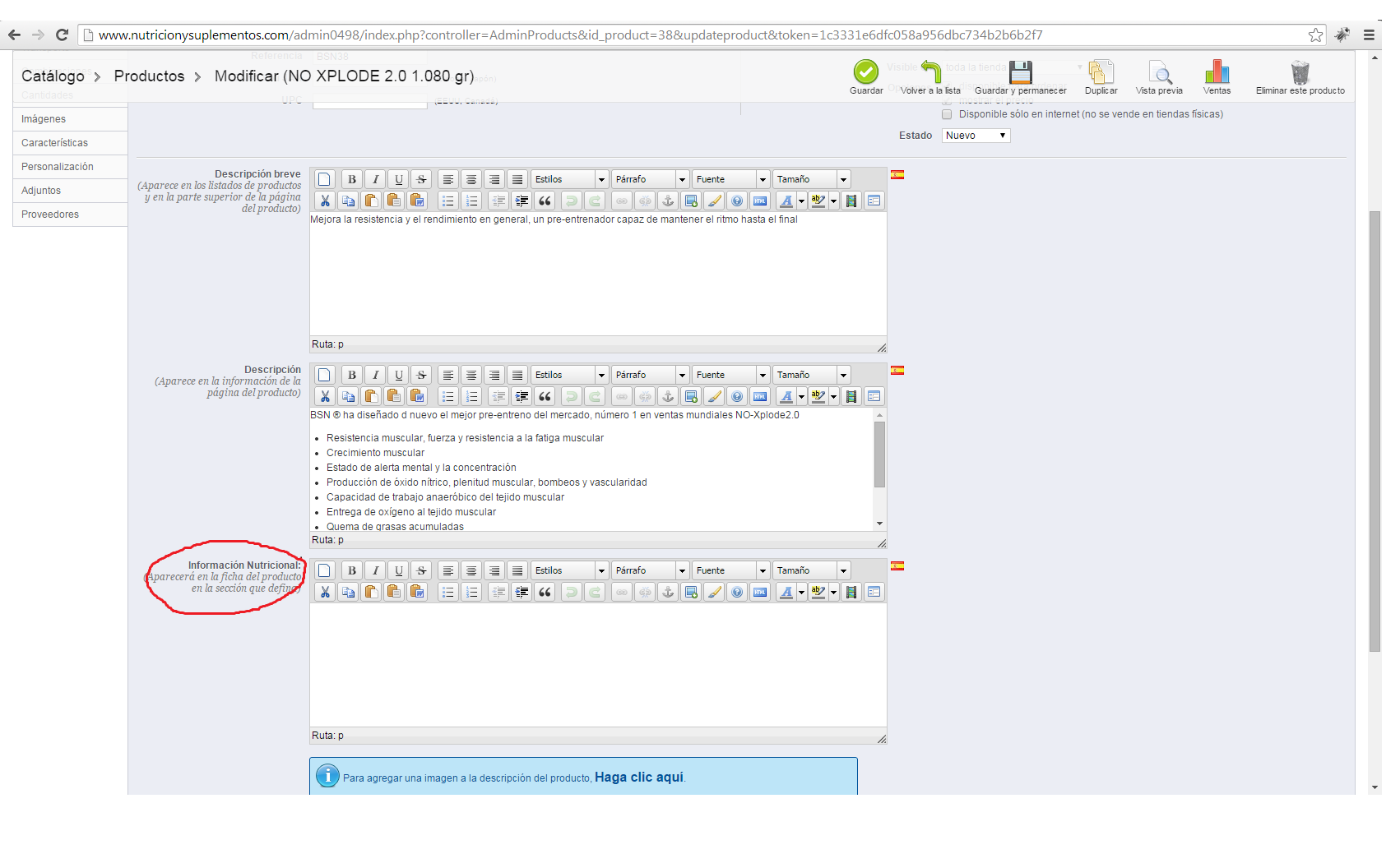 juampaa15 Posted October 31, 2014 Share Posted October 31, 2014 (edited) Hola comunidad, Soy nuevo en el foro, si hago algo mal díganmelo El caso es que quiero añadir un campo de información al producto que se llame Información Nutricional y que aparezca al lado de la descripción en una pestaña a parte en la pagina del producto cuando tu clicas en el. He leído tutoriales para hacer esto, donde se debe modificar la base de datos y algunos archivos de la pagina, pero en todos aparece este archivo: admin/themes/default/template/controllesrs/product/informations.tpl Y yo en mi servidor ftp no tengo la carpeta template dentro de default ni dentro de la carpeta del tema que estoy utilizando y por tanto se donde esta el archivo information.tpl para modificarlo Alguien sabe donde esta? o como añadir este campo a un producto en PS 1.5.6?? PD: el campo aparecería en el backoffice a la hora de añadir un producto, debajo de la descripción, otro campo igual que la descripción pero con otro nombre. Gracias! Edited November 3, 2014 by juampaa15 (see edit history) Link to comment Share on other sites More sharing options...