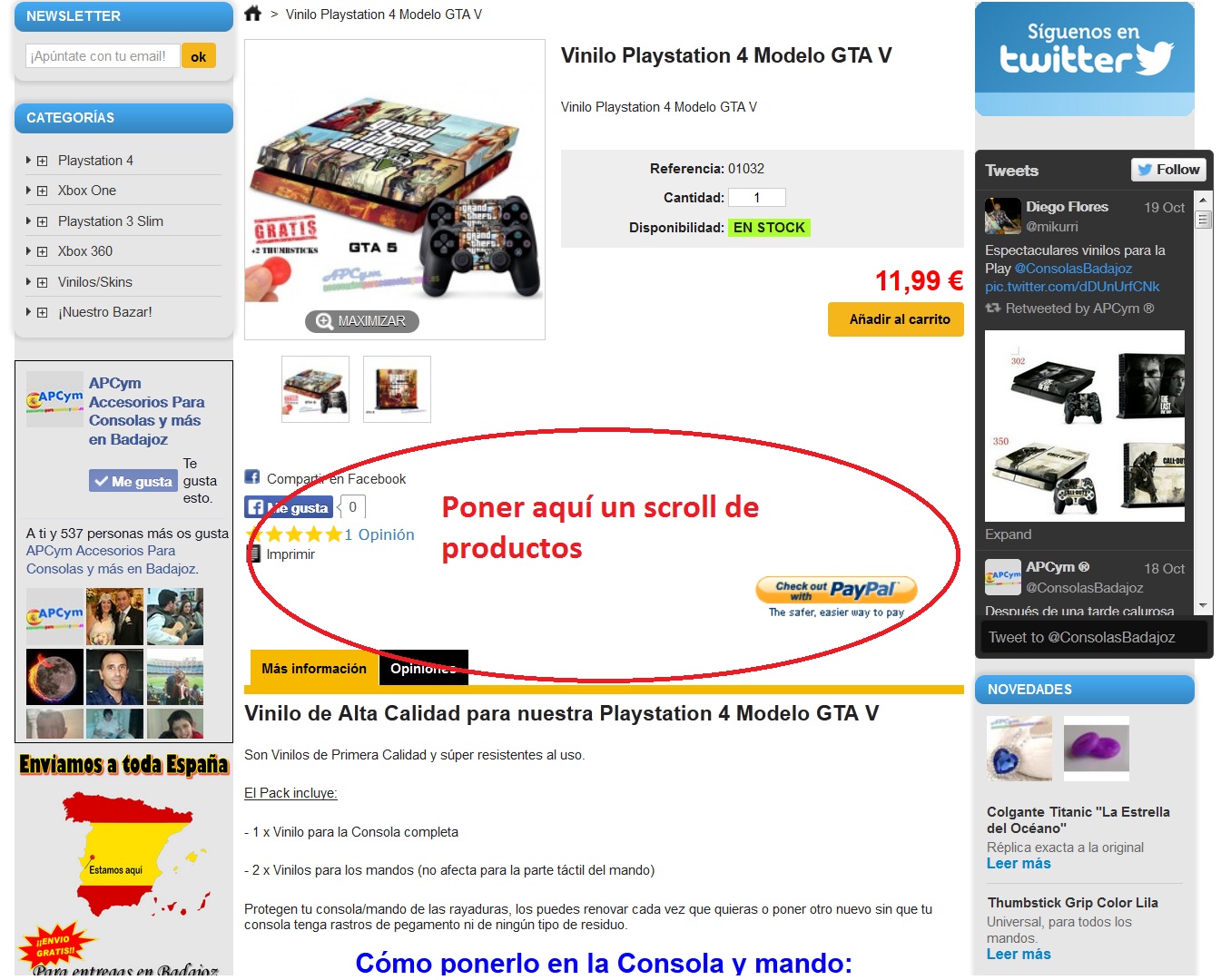 marvarez Posted November 2, 2014 Share Posted November 2, 2014 (edited) Hola! me gustaría saber si hay alguna forma de que a la hora de que un cliente entre en un artículo podererle sugerir más productos relacionados con lo que está buscando, por ejemplo: un cliente que entre para comprar un vinilo de PS4 de Assassins creed, pues que en la misma pantalla del vinilo, le salgan los productos que le vendrían bien relacionados con ese artículo como podrían ser: un colgante de assassins creed, una taza de assassins, unos vinilos de assassins para el mando etc.... He notado que muchos de mis clientes que entran para comprar un vinilo por ejemplo, no saben que existen los demás productos que comento, y cuando hablo con ellos y se lo comento, es cuando dicen que no sabían que eso existía y que sí que les interesa y terminan comprándolos. Para evitar que yo tenga que asesorar 1x1 a cada cliente, habría alguna forma de que salgan estos productos? Con un scroll, o directamente un listado o algo? (adjunto foto de ejemplo) Si hay algún módulo de pago, incluso estaría interesado en comprarlo. WEB: www.accesoriosparaconsolasymas.es PS: 1.5 ¡Muchísimas gracias! Edited November 2, 2014 by markezmarkez (see edit history) Link to comment Share on other sites More sharing options...