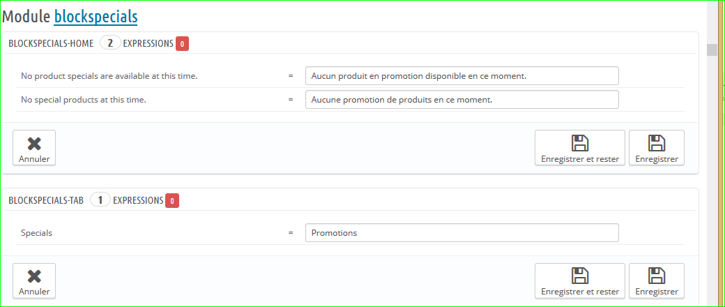 S-HAMMANI Posted November 14, 2014 Share Posted November 14, 2014 Bonjour Aller dans BO > Modules > blockspecials > configurer : 2° bloc Paramètres > Gérer les traductions > Module Blockspecials : et remplir ou modifier ces champs 1 Link to comment Share on other sites More sharing options...