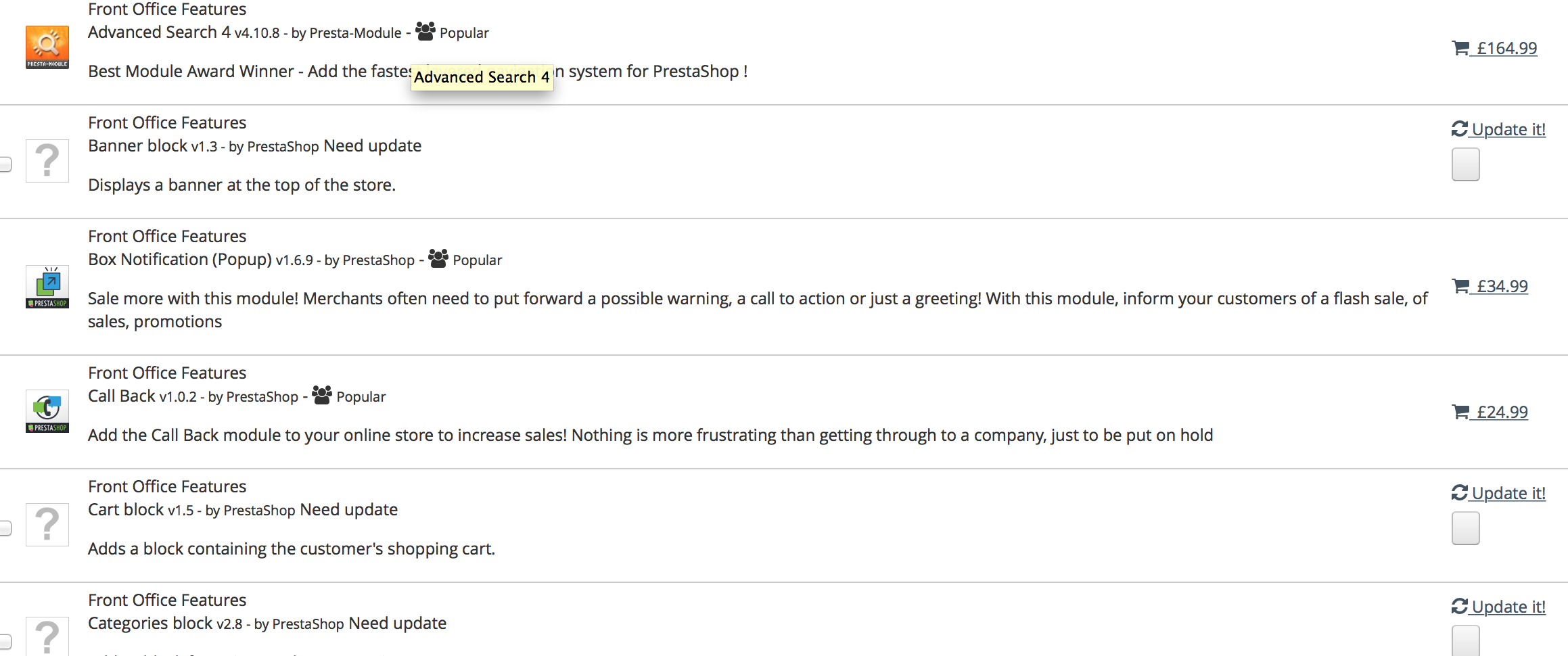 jackbeanoffendsyou Posted November 4, 2014 Share Posted November 4, 2014 Hello When I go to MODULES tab in the back office. I can only install and upgrade, I cannot edit or configure. This is only since 1.6 upgrade. There is a grey button next to the name of the module, but clicking it does nothing. Please help? Thanks! Link to comment Share on other sites More sharing options...