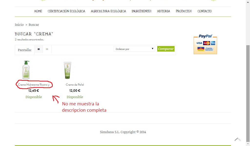 fernandoafernandezpa Posted November 4, 2014 Author Share Posted November 4, 2014 Pues no se que version de prestashop usas ni siquiera la plantilla que usas. ¿En el product-list.tpl tienes un truncate en la descripción? (Se trata de aumentar el numero del truncate para ver mas texto) A lo mejor tambien tienes que tocar en el css que los bloques de los productos sean mas altos, etc.. Pasa url de la web para ver http://www.econanosworld.com/tienda/index.php Link to comment Share on other sites More sharing options...