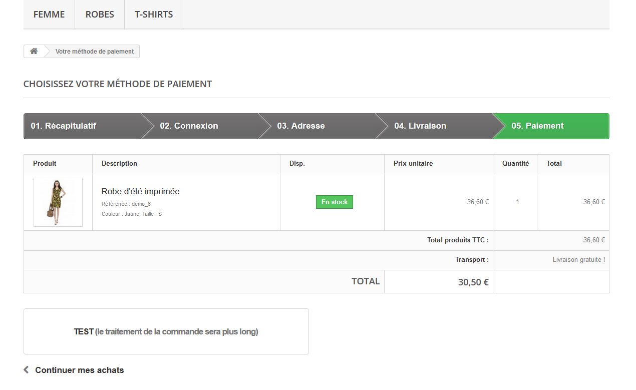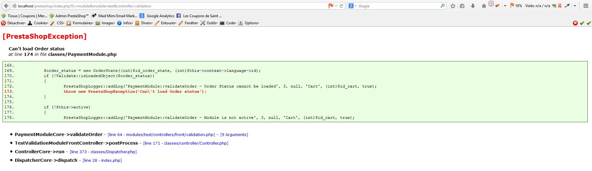 lcdsp Posted November 5, 2014 Share Posted November 5, 2014 Bonjour, J'essaie en vain de dupliquer n'importe quel module de paiement, j'ai tenté le module "cheque" et je me suis rabattu sur "bankwire" pensant que mon problème venais de la complexité du module "cheque". Je veux dupliquer un module de paiement afin de le personnaliser, de l'installation de celui-ci à la prise de commande mon module dupliqué nommé "test" fonctionne jusqu’à l'étape de validation (voir pj) Voici l’erreur: [PrestaShopException] Can't load Order status at line 174 in file classes/PaymentModule.php 168. 169. $order_status = new OrderState((int)$id_order_state, (int)$this->context->language->id); 170. if (!Validate::isLoadedObject($order_status)) 171. { 172. PrestaShopLogger::addLog('PaymentModule::validateOrder - Order Status cannot be loaded', 3, null, 'Cart', (int)$id_cart, true); 173. throw new PrestaShopException('Can\'t load Order status'); 174. } 175. 176. if (!$this->active) 177. { 178. PrestaShopLogger::addLog('PaymentModule::validateOrder - Module is not active', 3, null, 'Cart', (int)$id_cart, true); PaymentModuleCore->validateOrder - [line 64 - modules/test/controllers/front/validation.php] - [9 Arguments] TestValidationModuleFrontController->postProcess - [line 171 - classes/controller/Controller.php] ControllerCore->run - [line 373 - classes/Dispatcher.php] DispatcherCore->dispatch - [line 28 - index.php] Merci d'avance pour votre aide Link to comment Share on other sites More sharing options...