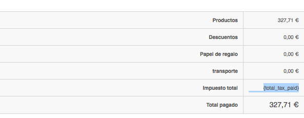 bultaco Posted November 11, 2014 Share Posted November 11, 2014 Hola. Cuando el cliente recibe el Correo de confirmación de pedido, el campo correspondiente al Impuesto total aparece con la variable {total_tax_paid} en vez de aparecer el valor correspondiente. Hemos mirado, consultado y probado decenas de posibles soluciones que hemos visto pero nada, no se soluciona. La versión de Prestashop que utilizamos es la 1.6.0.6 1 Link to comment Share on other sites More sharing options...