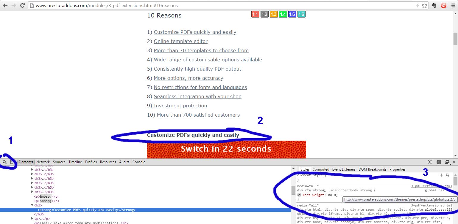Dolke Posted November 14, 2014 Author Share Posted November 14, 2014 Show debug panel in Chrome or Firebug using F12 and locate these DOM elements. Thank you tuk66, I'm familiar with existence of debug mode on the browsers but I'm not familiar with how to use them in order to locate the actual files where I need to make these changes... Difficult to be specific without a live site and the use of an inspector, but I think the CSS files to edit would be product.css and product-list.css files for No. 1 and 2 respectively. Thanks, but I'm not able to associate element with the actual object that I'm changing... Link to comment Share on other sites More sharing options...