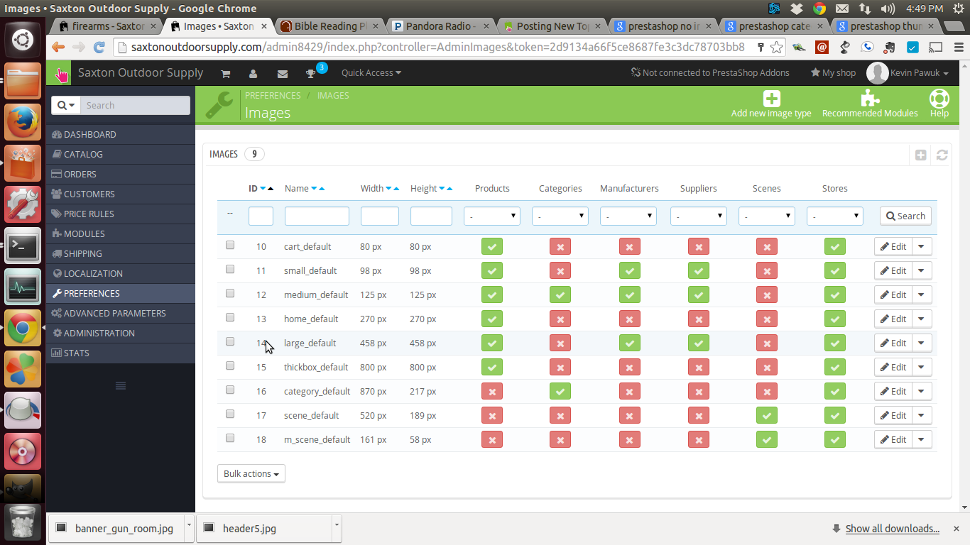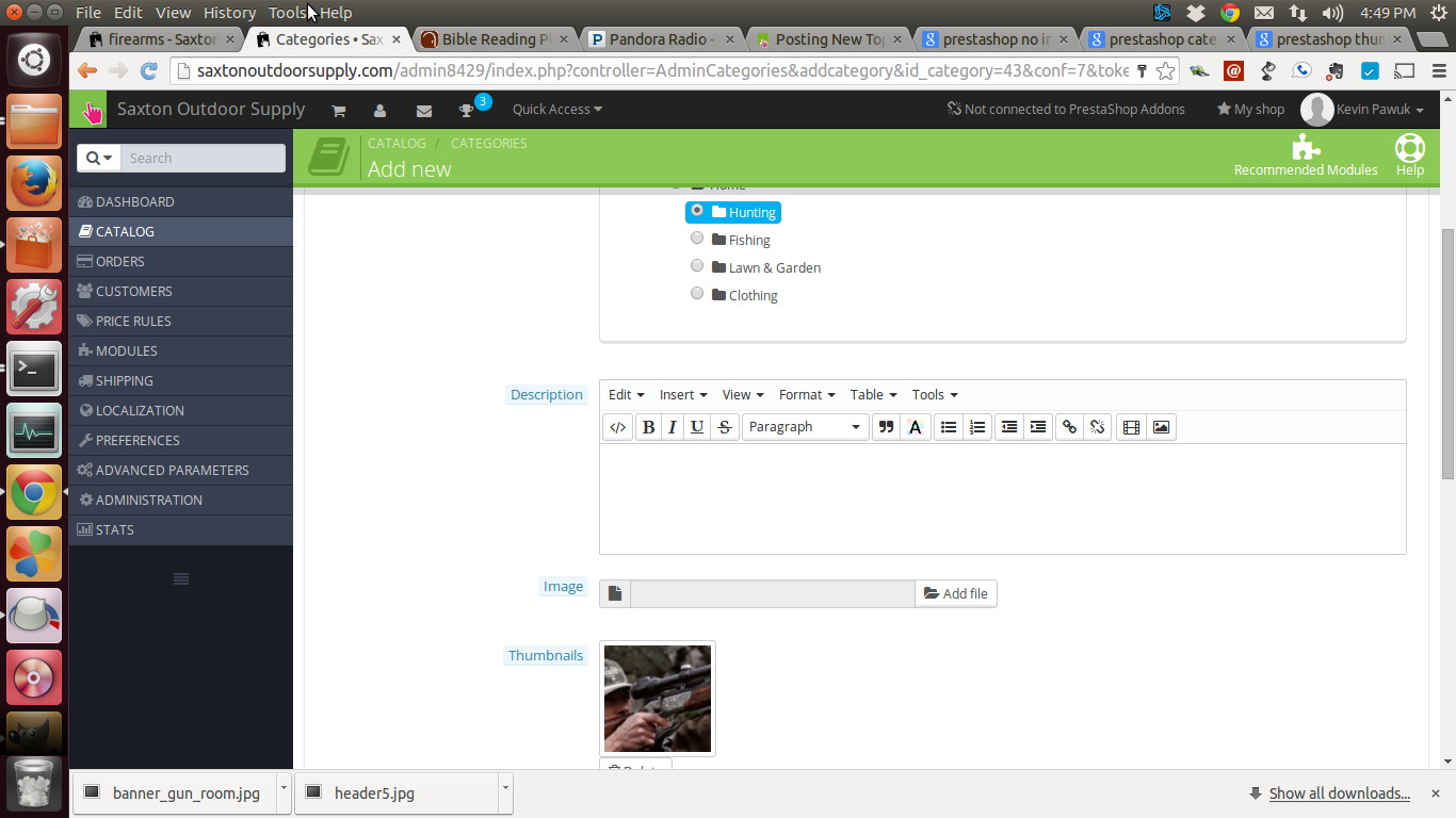 imrathion Posted November 13, 2014 Share Posted November 13, 2014 I installed PS 1.6.0.8 fresh and installed a Theme. I have edited my categories and subcategories. I am now trying to add images to said categories and subcategories. I created banner size images for my main categories (870x217) and uploaded them. So far so good. I ran into a snag when trying to upload and display thumbnail images for my sub categories (which I do NOT want to use banner size images for). I add the thumbs to the subcategory and save and they do not appear on the front office. What gives. here are the screen shots of my Preferences>Images and Subcategory Edit page. My url is www.saxtonoutdoorsupply.com Thanks in advance for your help Link to comment Share on other sites More sharing options...